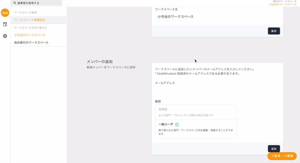 ワークスペース情報設定からメールアドレスを使って共同編集したい⼈を招待することができます。同じ組織のメンバーだけでなく⼿伝ってくれているフリーランスの⽅まで、ご⾃⾝のプロジェクトに関与している⼈と簡単に共同編集できるサービスとなっています。