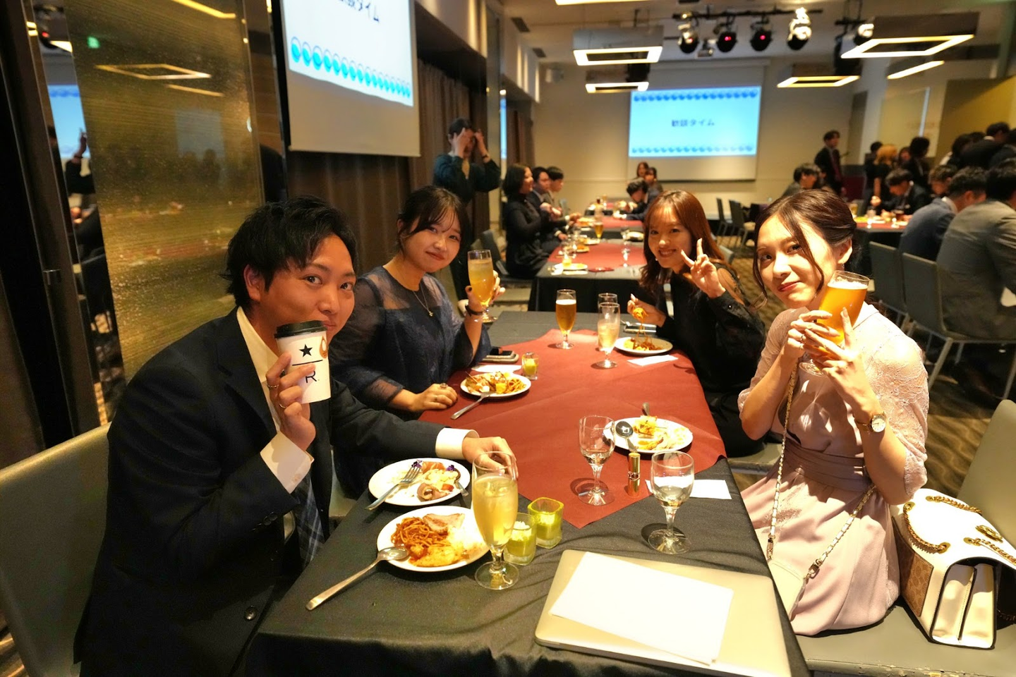 歓談タイムはビュッフェ形式で料理や飲み物が提供され、それぞれ美味しかったメニューなどを共有しあうなど、いつもは話さないメンバーとの交流も自然と生まれる雰囲気でした。