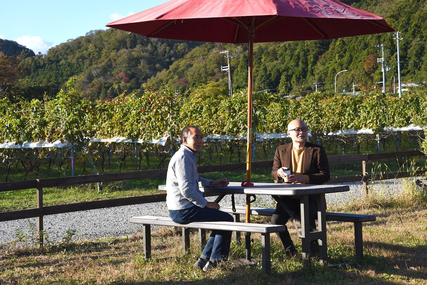 [写真]秋保ワイナリーにて代表の毛利さんと、ブドウ畑を背景に