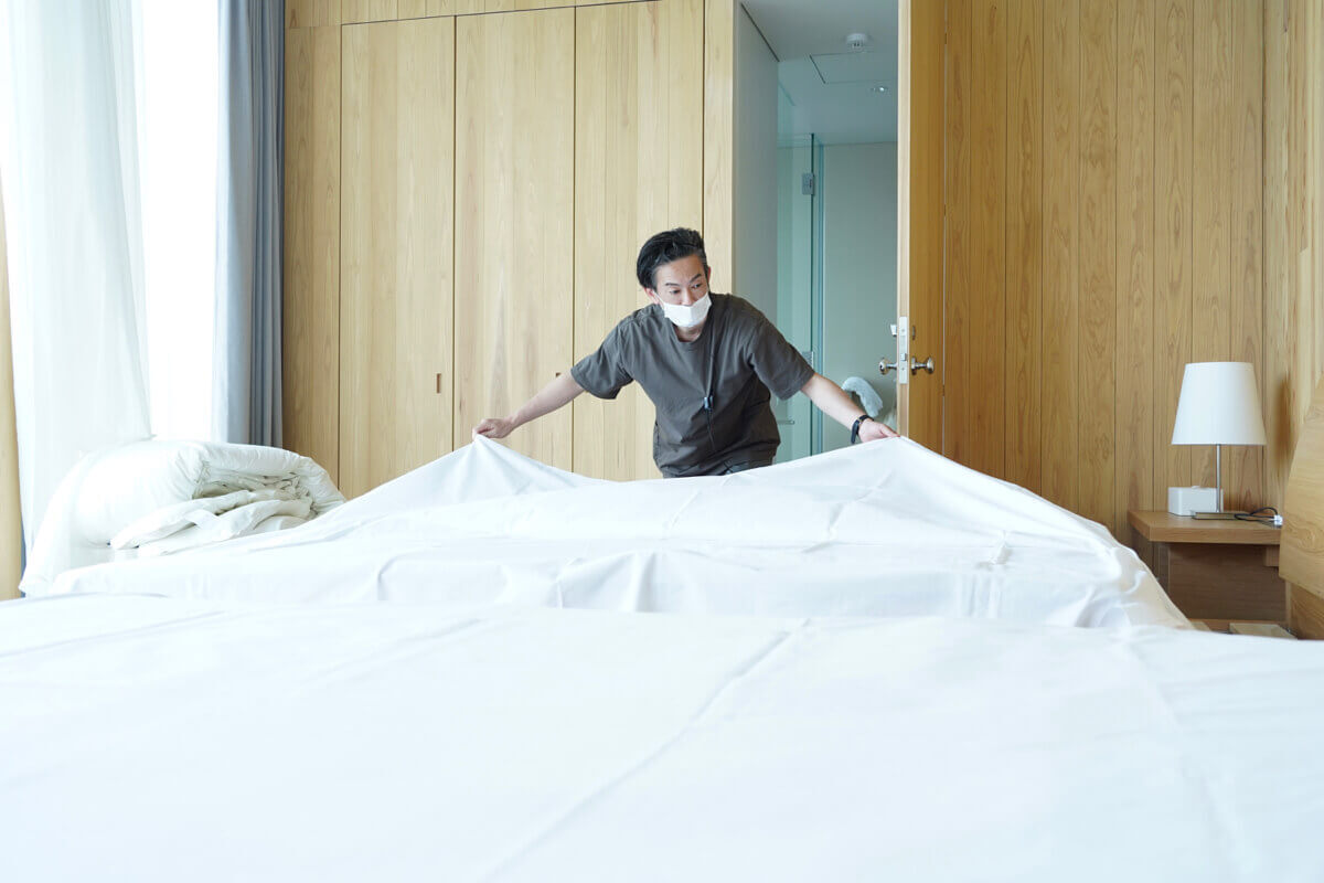 しかし、本当に必要であれば自分たちで作ろうということで、数年前青山さんがリネン屋さんを自分たちで作ったんです。そのため今Entôではリネン工場も自分たちで運営しています。なのでEntôではホテルの清掃とリネン工場でシーツやタオルをクリーニングすることの両方を担っています。朝からリネン工場でシーツを洗濯している日もあれば、昼まではEntôで客室清掃を行って昼から洗濯機と乾燥機を回しに行くこともあります。