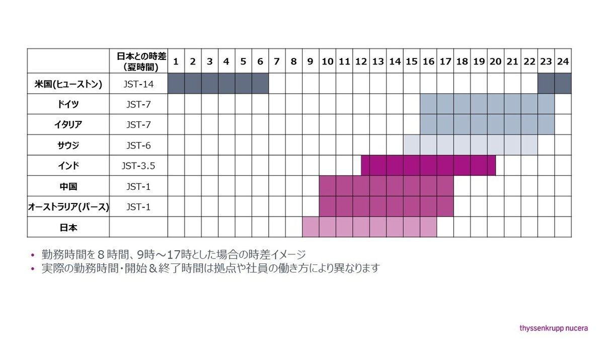 グローバル企業で働く上で考慮しないといけないのが時差問題です。当社はドイツ、イタリア、米国、サウジ、インド、中国、日本、オーストラリアに拠点があり、各拠点と日々コミュニケーションを取っています。