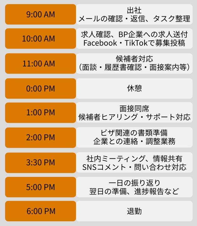 現在は、特定技能ビザで働きたい方と日本の企業をつなぐ仕事をしています。求職者の話を聞いたり、企業とのマッチングを行ったり、面接のスケジュールを調整したりしています。特に、ネパールの方々のサポートを中心に担当しています。
