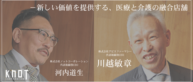 第4 回目の対談は、株式会社アピスファーマシー代表取締役CEOの川越敏章さんです。大きく変化する社会の中で多様化するニーズに対して提供する新しい価値や事業発展におけるコン セプトやアイデアの重要性についてなど、ノットコーポレーション代表河内と語り合っていただきました。株式会社アピスファーマシー 代表取締役CEO川越敏章氏地域に根ざしたかかりつけ薬局「アピス薬局」、「テトラ薬局」を78店舗経営。認知症カフェ「アピスパ ーク」を運営するなど、誠実で真心のこもった医療・福祉関連サービスを提供している。また、ネット通販やオリジナルのアピスブランド商品の開発も手がけ、国内外での販売も伸ばしている。...