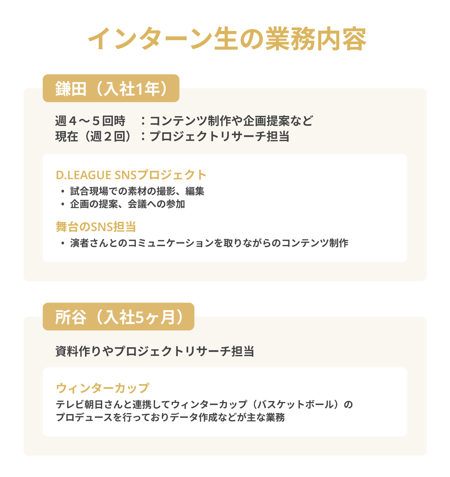 所谷:僕は基本的に、社員さんが会議で使用する資料作りやプロジェクトのリサーチを担当しています。最近では、バスケットボールのウィンターカップに関わるSNSをテレビ朝日さんと連携してプロデュースしているのですが、その際に使用するデータを作るなどの作業が主です。