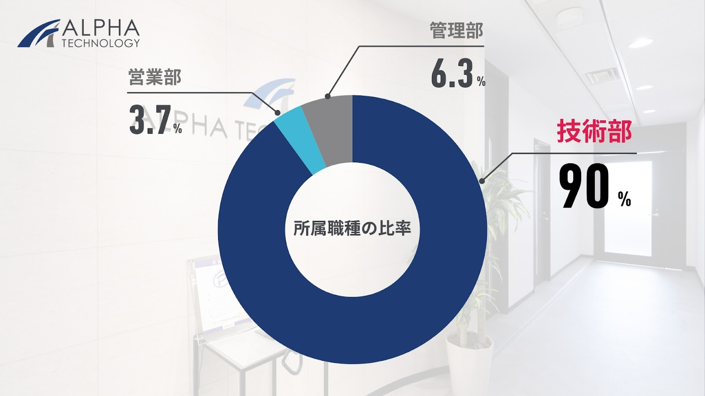 当社の最大の特徴は、全社員のうち90%が技術部門に所属しているという点です。