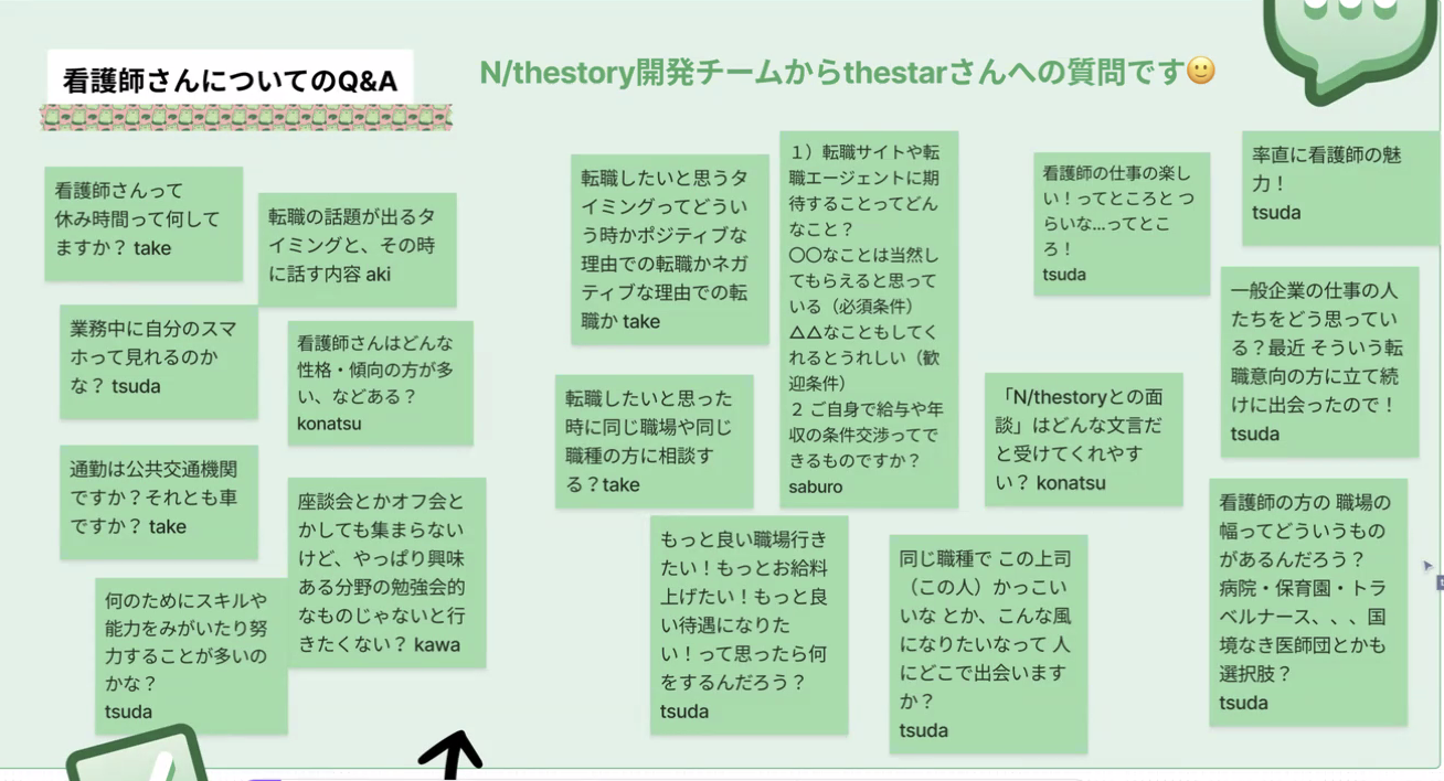 転職相談はいつ?誰に?どんなふうに行ってる?どんな相談が多い?そんなことを聞きながら、じゃぁN/thestoryでできることは何か?なんて話したり。話題はどんどん変わって、ついには夜勤帯によく発生するらしい看護師のキャリアに関する悩み相談の実態まで知ることができました。先輩看護師にいろんな相談をしている方も多くいらっしゃるようで、そういう相談先になれたらいいなあ、と個人的には思ったりしました。