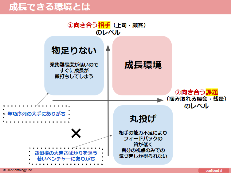 ②課題の難易度だけが高くて①優秀なフィードバッカーがいない環境というのは、裁量の大きさばかりを謳うベンチャーにありがちです。このメッセージを読んでくれている、成長意欲の強いベンチャー志向の方はこれに注意すると良いと思います。「若いうちから裁量を持たせてもらえる」という魅力的なメッセージは多くのベンチャー企業で謳われていますが、いきなり裁量の大きな仕事を任せられる「だけ」で、的確な課題設定やフィードバックをしてくれる上司がいない環境では、自分自身の視点でしか気づきが得られず、なかなか本質的な成長に時間がかかってしまうパターンです。