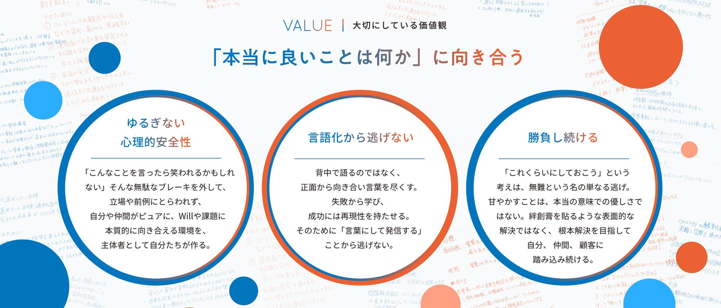 上記記事を読んでいただけたら分かる通り、emologyでは、『「本当に良いことは何か」に向き合う』ために「ゆるぎない心理的安全性」「言語化から逃げない」「勝負し続ける」をVALUEとして据えています。