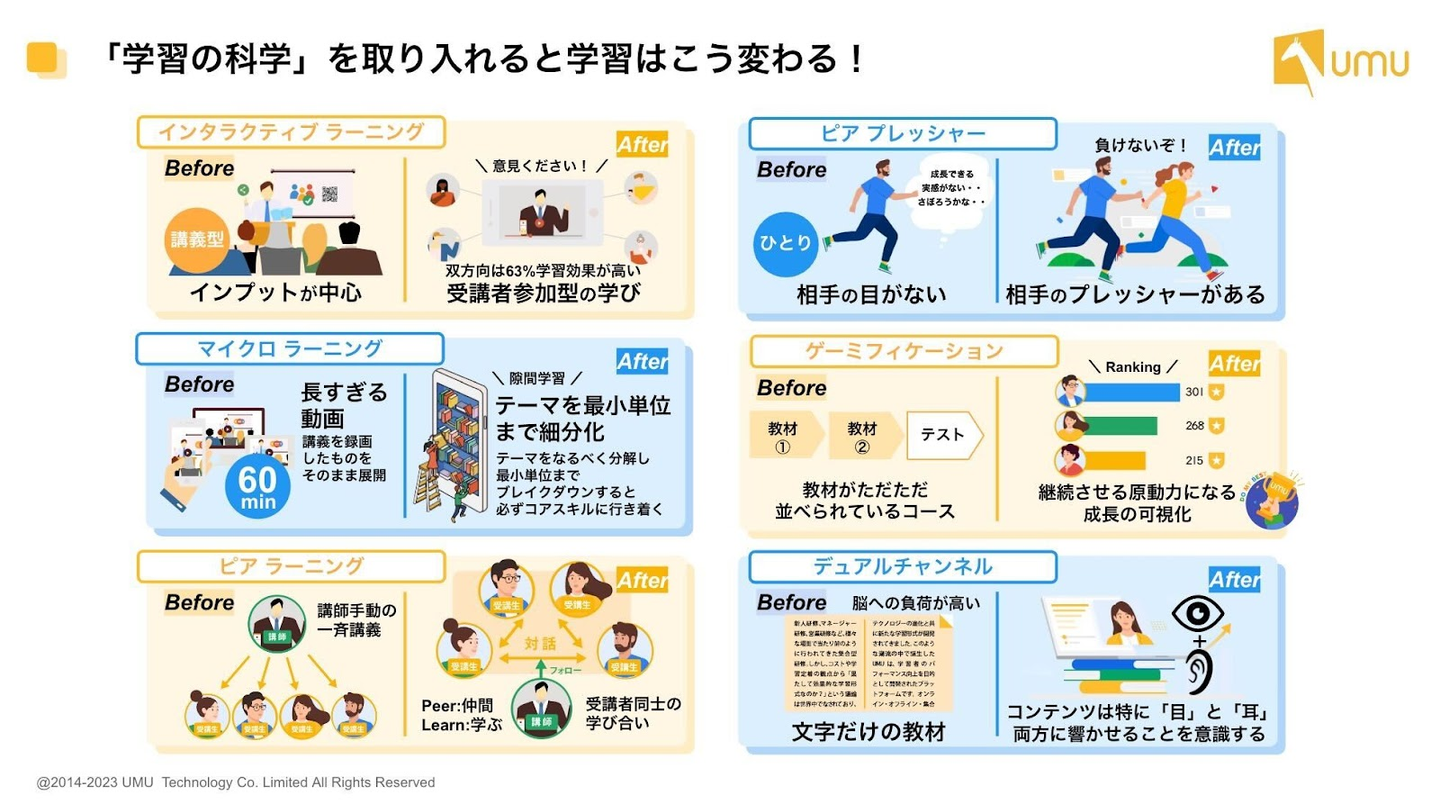 UMUはこれら2つの課題を乗り越えるために、最先端のAIテクノロジーと科学的アプローチを駆使し、個人と組織の学習シーンにダイナミックなイノベーションを起こしてきました。