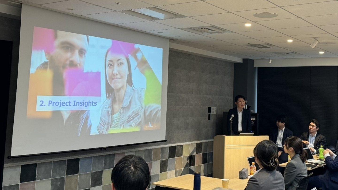 研修終了後、先月をもってクローズしたプロジェクトの報告が実施されました。クロスフィールドとしてこれまでにない規模で多くの社員が携わるグローバルプロジェクトであったため、プロジェクトにアサインされた7名の社員がグローバルプロジェクトならではのエピソードや教訓について発表しました。