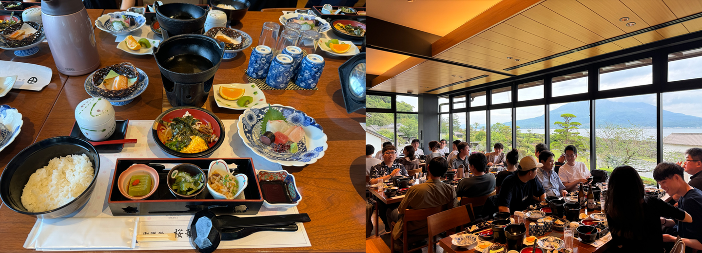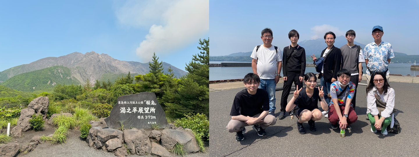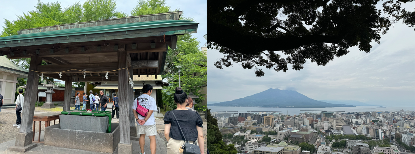 午後は鹿児島のシンボルともいえる桜島に移動し、黒豚のしゃぶしゃぶやとんかつなどを堪能しました。昼食後は溶岩なぎさ公園で錦江湾の風景を眺めながら足湯に浸かったり、島内の展望台を巡ったりなど、人気のスポットや景観を楽しむことができました。中でも荒々しい山肌と噴煙を上げる南岳の眺めは圧巻でした!