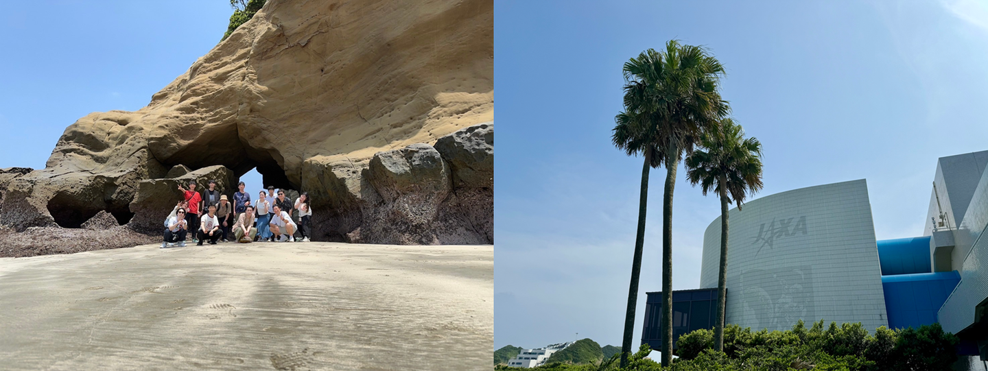 鹿児島市内の港を出て、1時間半ほど波に揺られ西之表港に到着後、港から海岸沿いを南下しながら宇宙科学センターを目指しました。天然記念物のガジュマル(防風林)や、雄龍雌龍の岩へ立ち寄ったり、一面に広がる海景色を楽しんだり、道中の道草を楽しみました。西之表港と宇宙センターとの中間地点にあるカフェで少し早めの昼食をとり、午後は千座の岩屋に向かいました。潮が引いていたため、洞窟の中まで散策することができました。洞窟内はひんやりとしており、岩肌からは自然の息吹を感じました。