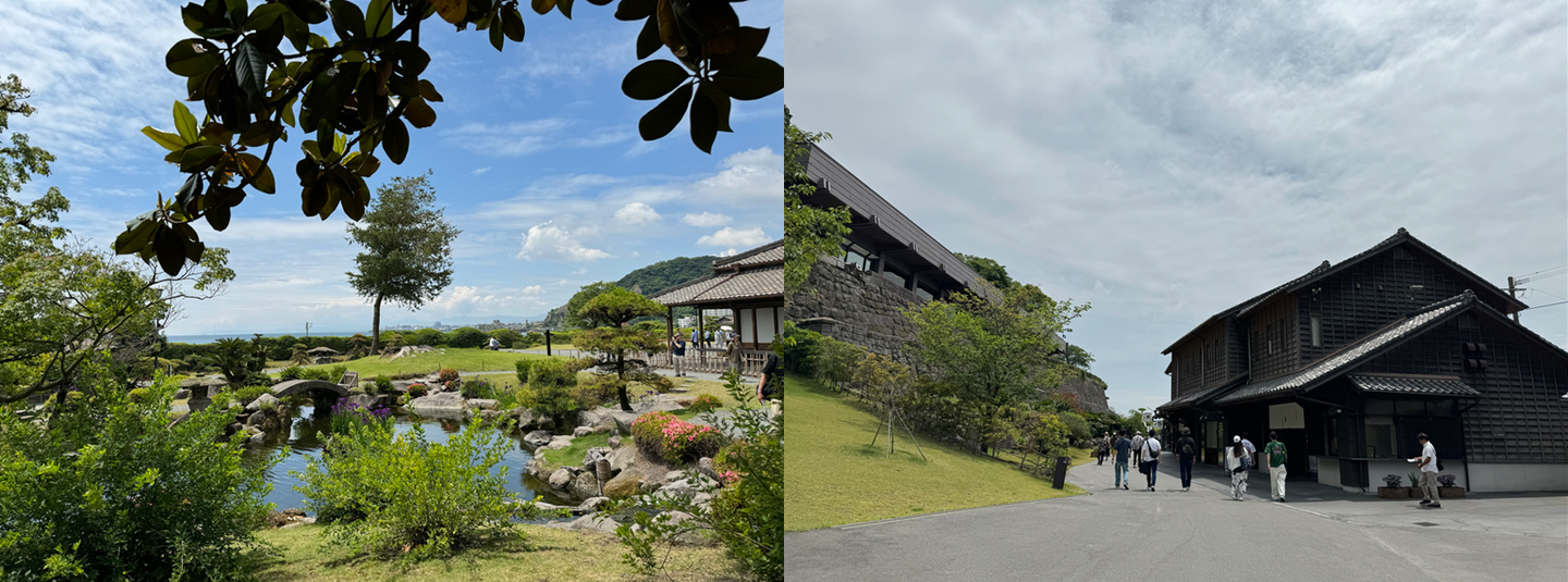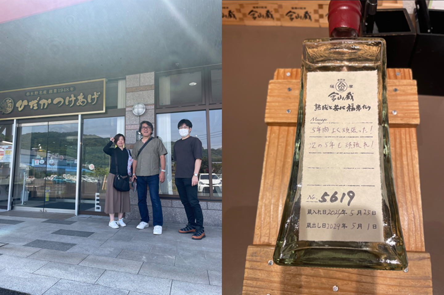 夏の兆しを感じる快晴の空の下、海風を浴びながら、まずは串木野にある甘く香ばしい匂いのさつま揚げ工場に見学へ。出来立てに舌鼓を打ちつつ、ニラ入りなど普段見ない種類の豊富かつ美味しそうな品揃えに買う手が止まりませんでした。海沿いに進み、薩摩スチューデントが出航した地、薩摩藩英国留学生記念館で歴史に触れつつ、見晴らしの良い海辺を背景に穏やかなランチタイムを過ごしたのち、景観一転、緑生い茂る山間の金山蔵という酒蔵にも訪問しました。酒蔵奥の金鉱石を祀るお社で金運にも肖りつつ、5年後の自分へ送る焼酎など珍しいものなどを購入し、帰り道では薩摩焼の沈壽官陶苑にて、皆思い思いに気に入った酒器を手に取りました。長閑に、土地の良いものに巡り会える良い旅でした。