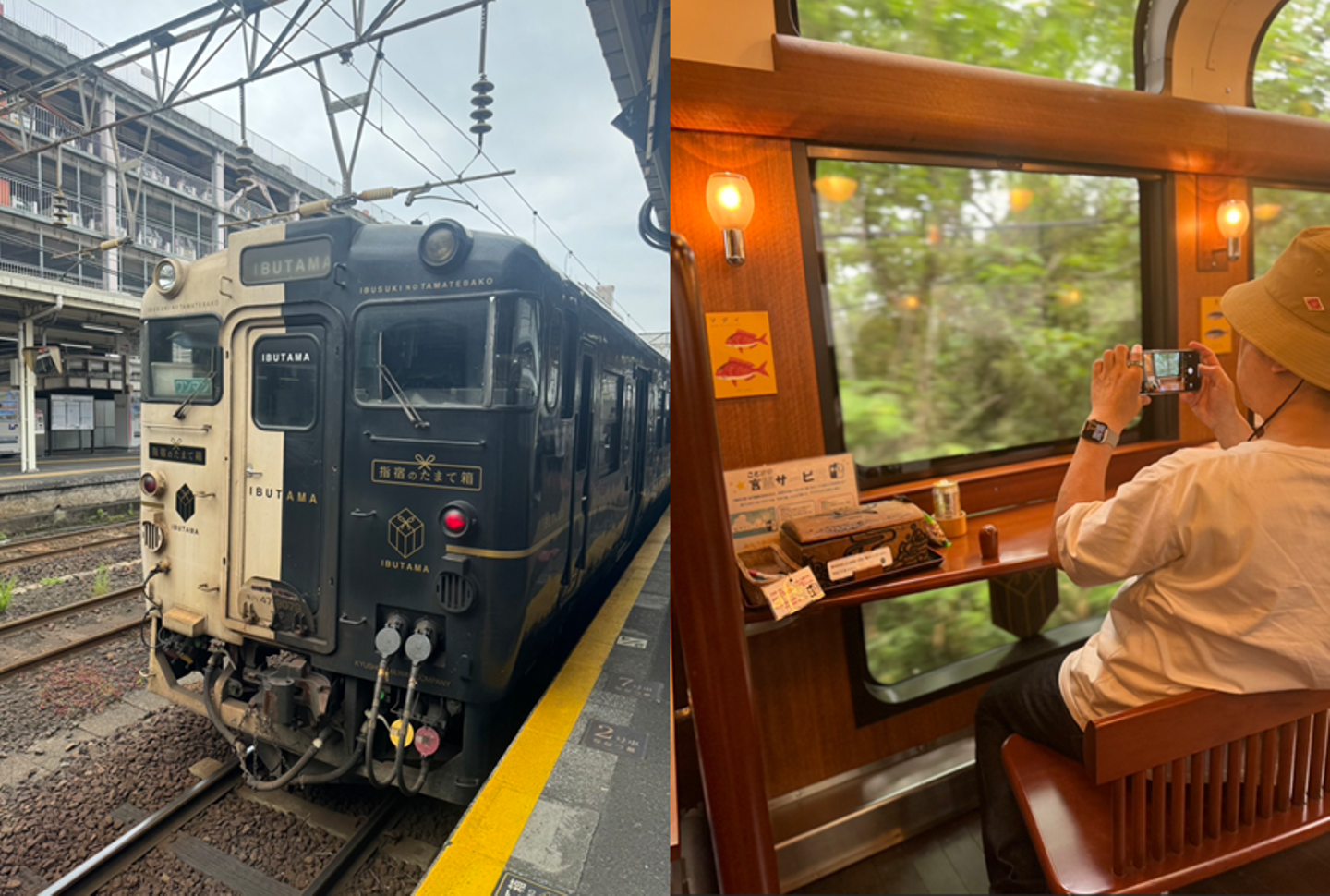 2日目に種子島に行った筆者ですが、「短くても砂風呂を体験したい!」ということで指宿への弾丸ツアーを決行しました。朝7:45鹿児島港発の高速船に乗り一路指宿へ、9:00には前日にもCFメンバーが訪れたであろう砂むし会館 砂楽に到着しました。人生初の砂風呂は少し(かなり?)踵が熱かったものの、程よい熱さと重さの砂に埋もれ、心地よい波音と相まって、日々の疲れを癒す非常にリラックスした時間を過ごすことができました。帰路の指宿駅では思いがけず特急列車「指宿のたまて箱」に遭遇。指宿が伝説発祥の地と言われる浦島太郎をモチーフにした列車にも乗ることができ、短いながらも充実した指宿旅行となりました。
