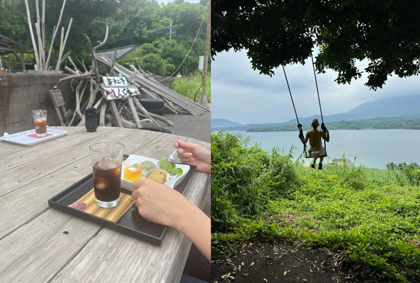 桜島を見ながら約50分のクルージングを経て上陸したのは夫婦2人だけが住んでいる新島。ご夫婦に温かく迎えられて、コーヒーやジュース、ケーキセットなどをいただきました。島の中へと進むと、桜島と海が一望できる丘へとたどり着きました。そこには木につるされたブランコがあり、絶景をバックにブランコをこぐメンバーの姿はまるでアルプスの少女ハイジのようでした! 乗ってきた船の故障により帰りが1時間程度遅れてしまいましたが、船を待っている間にご夫婦から島のガイドツアーを提案していただき、新島の歴史やご夫婦の経験など貴重な話をたくさんしていただきました。とてもお温かいご夫婦と島の自然のおかげで、非常に癒しの多い旅となりました!