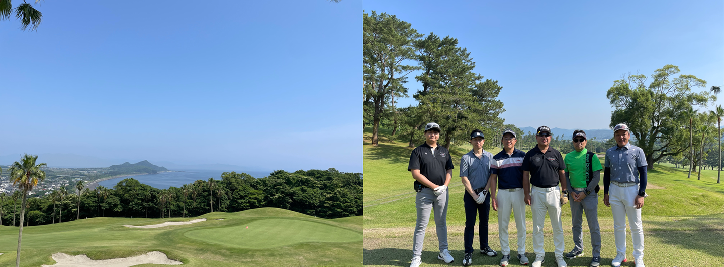 鹿児島が誇る名門「いぶすきゴルフクラブ」に到着しました!ここはかつて、あのタイガー・ウッズもプレー(日本初参戦)したゴルフ場です。薩摩富士こと開聞岳の山麓に広がる自然の地形を生かしたコースデザインと、素晴らしい景観を堪能していると、あっという間に前半9ホールが終了ました。昼食と一緒にタンカンジュースをいただき、いざ後半ラウンドへ!と、気合を入れて臨んだものの、5月下旬とは思えない猛烈な暑さによって、全員ヘトヘト…。後半こそ言葉数が少なくなりましたが、鹿児島の地で雄大な自然を感じながらのラウンドは最高でした!