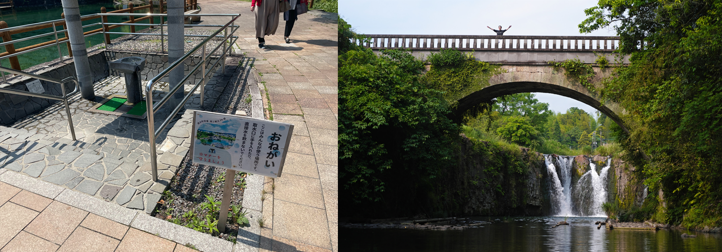 最初に、日本名水百選に選ばれている丸池湧水に向かいました。街のほとんどの生活水を賄っており、水を汲みにたくさんの人たちが来ていました。圧倒的な透明度とたっぷりのマイナスイオンで癒されました。