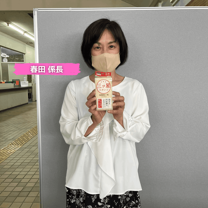 伊万里市出納室の係長です。スポンジやタオルといった生活必需品をいただきました。去年の4月に同じ部署でお仕事をさせていただき、部署が異なる現在も可愛がっていただいています。
