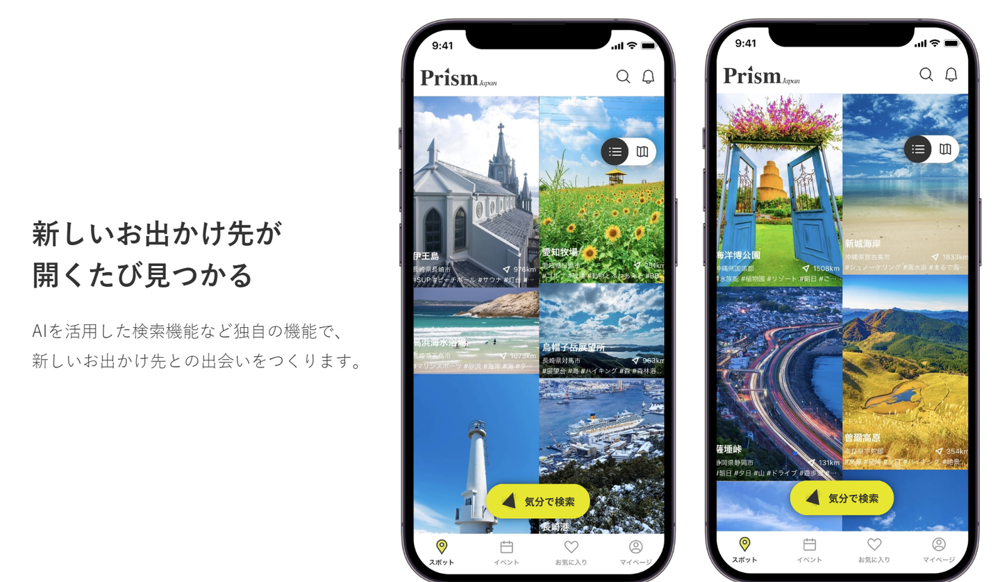 齋藤:「Prism Japan」は、2022年8月にリリースされた「お出かけ先インスピレーションAIアプリ」です。提示された2つの写真からピンときた方を選んでいくと、独自のAIがユーザーの好みや今の気分を分析し、適切なお出かけスポットを提案します。主な機能は、