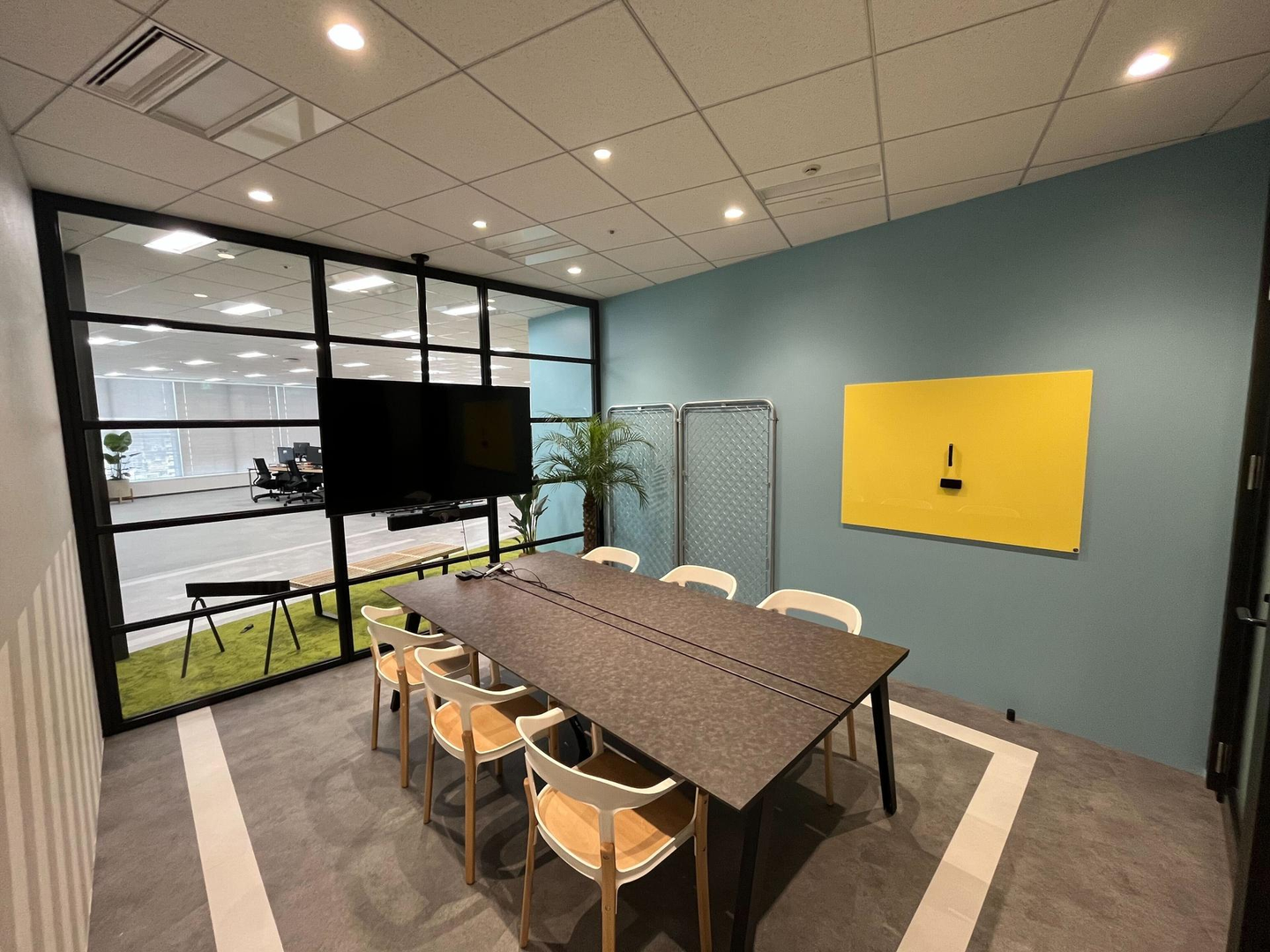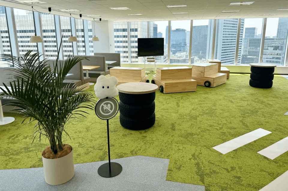 今回の移転では、“働きたくなるオフィス”を目指して、随所に工夫が施されています。 たとえばエントランスは“都会のグリーンリトリート”をテーマに、間接照明とグリーンが迎える癒しの空間に。 会議室はGARAGE・PIT・モータープールなど車にちなんだネーミングで統一され、遊び心と機能性を両立しています。