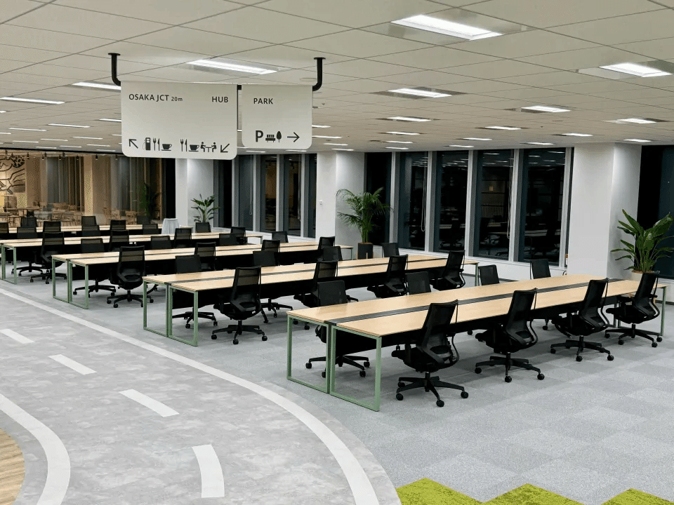 執務室内にはレーシングラインを模した床デザインが施されていて、チームの自然なすれ違いや会話を生む仕掛けに。 靴を脱いでくつろげる“PARK”や、1on1や雑談に使える“HUB”など、交流と集中が両立できるスペースも充実しています。