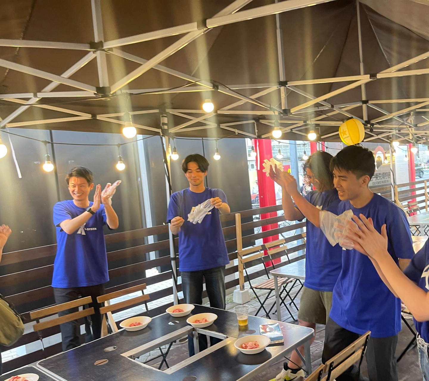 今回のBBQで私たちが特に大切にしたかったのが、内定者との交流です。5名の内定者にはそれぞれ違うテーブルに座ってもらい、既存社員が自由に席を移動しながら、たくさんのメンバーと話せるようにしました。