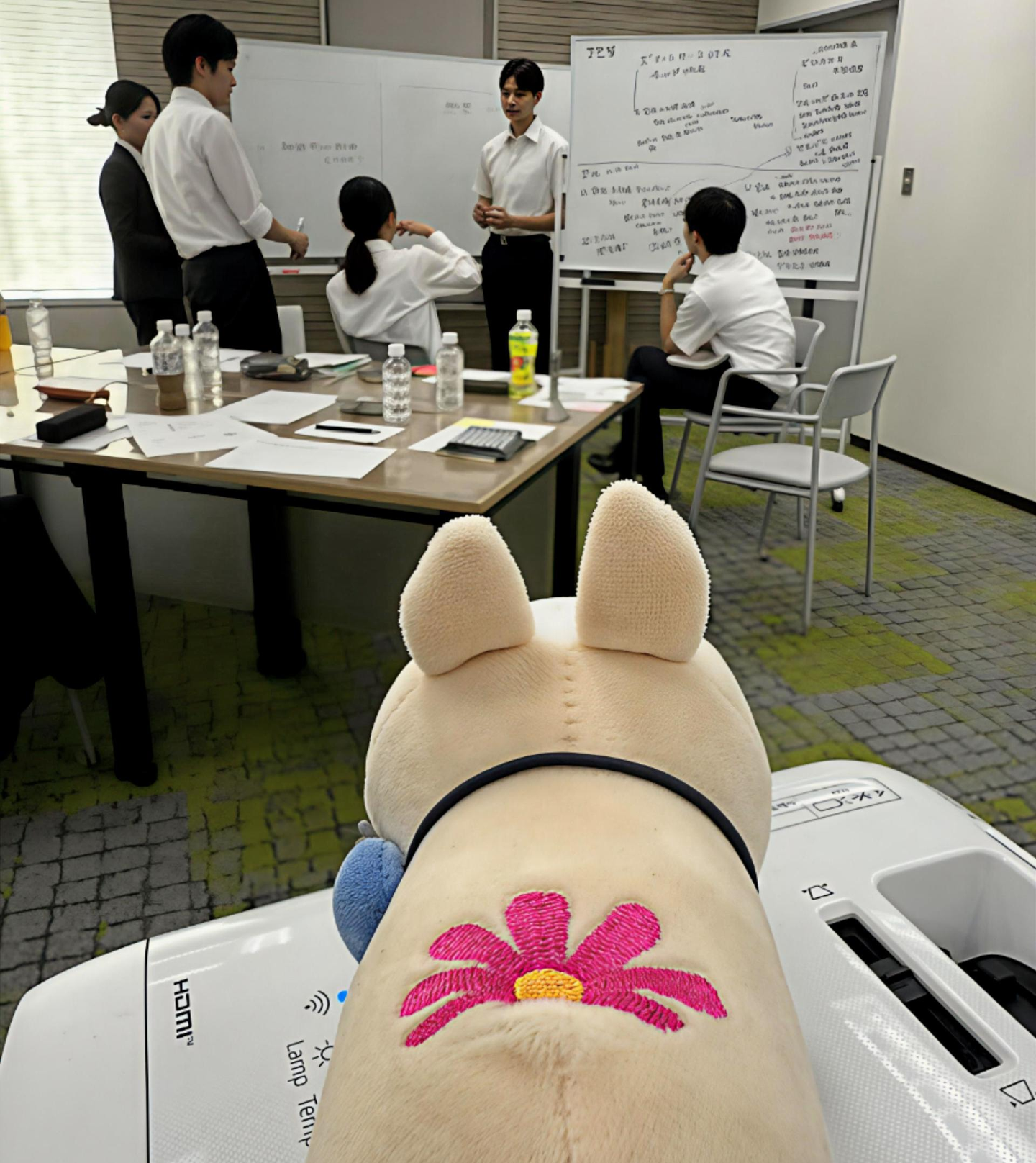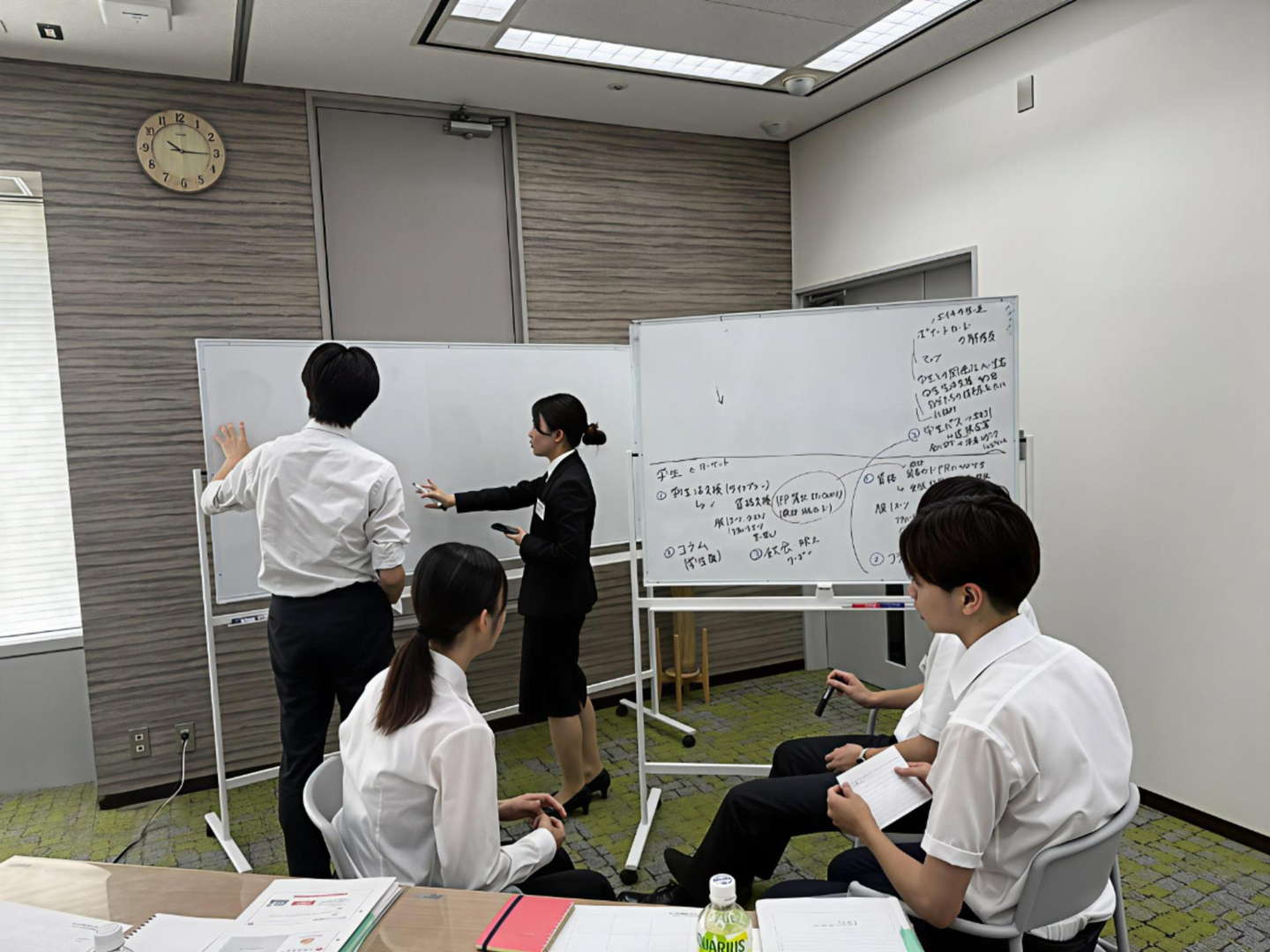 ▲ホワイトボードを囲み、真剣に議論を重ね、一人ひとりが持てる力を発揮
