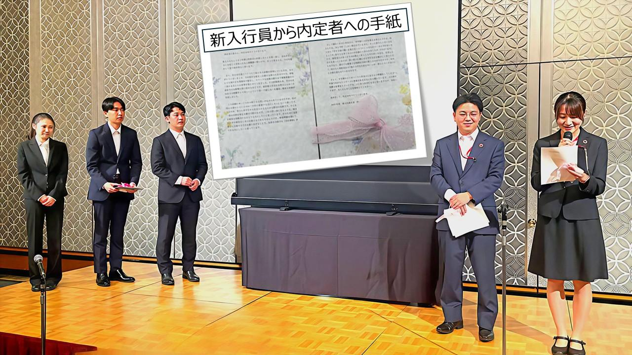 手紙を読み上げる声が、会場に静かに響く。そこには、先輩行員から来年入行予定の内定者への想いが綴られていた。