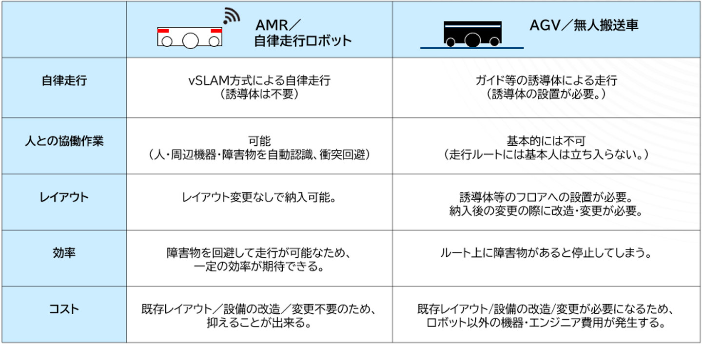 日本国内では、AGVが自動車業界を中心に広がり、先行したことより、AMRが「ガイドなしAGV」と呼ばれることがあるくらいです。また最近では、AMRに近いAGVの出現など、AMRとAGVの違い・境目がなくなりつつありますが、違いをまとめると下記のようになります。