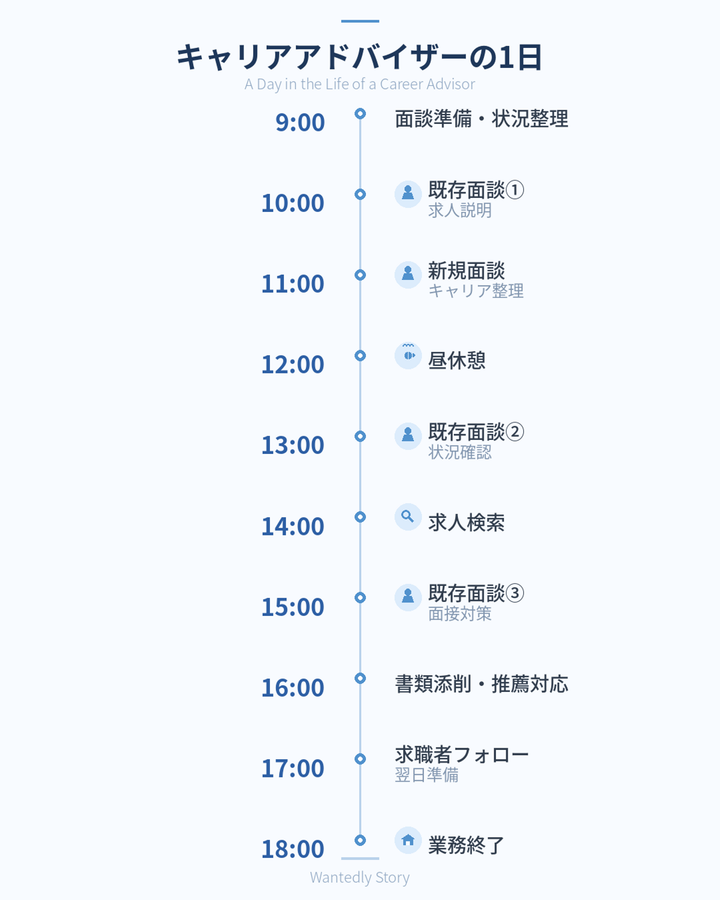 実際には、面談の前後にある「準備」や「フォロー」も含めて、1日の仕事が成り立っています。まずは、1日の流れをタイムスケジュールでご紹介します。