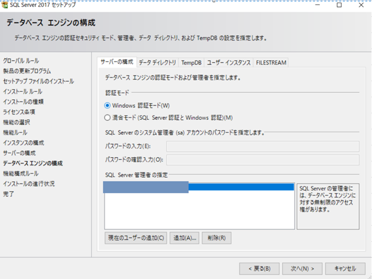 SQL ServerとWindows認証の混合モードを選択すると、パスワードを設定することができます。