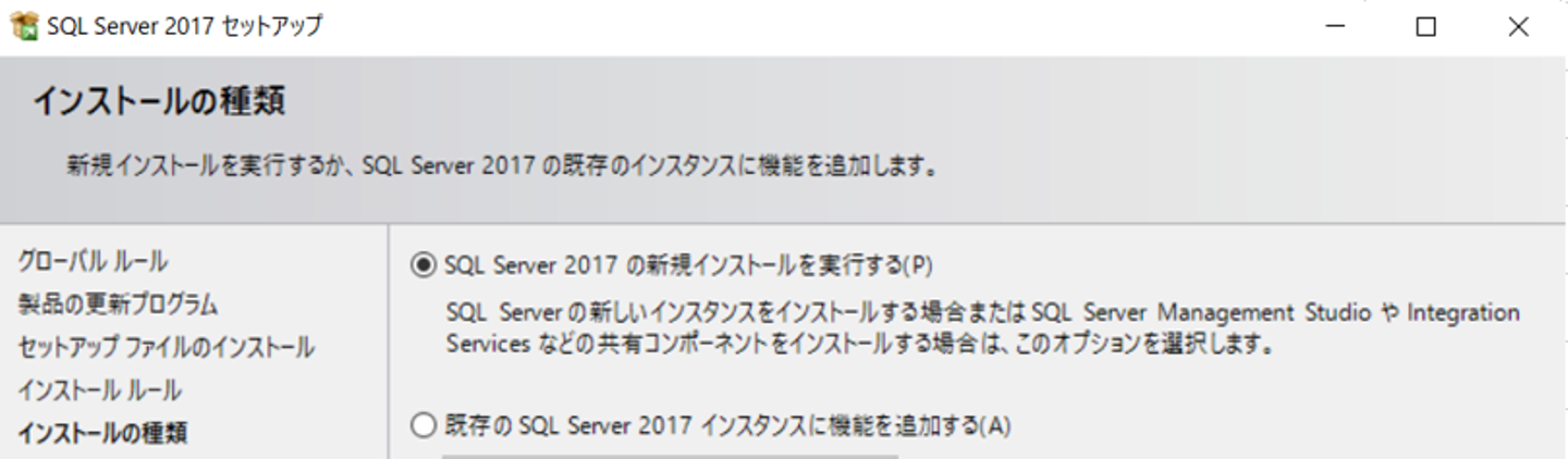 2)「SQL Server 2017の新規インストールを実行する」を選択して次へ