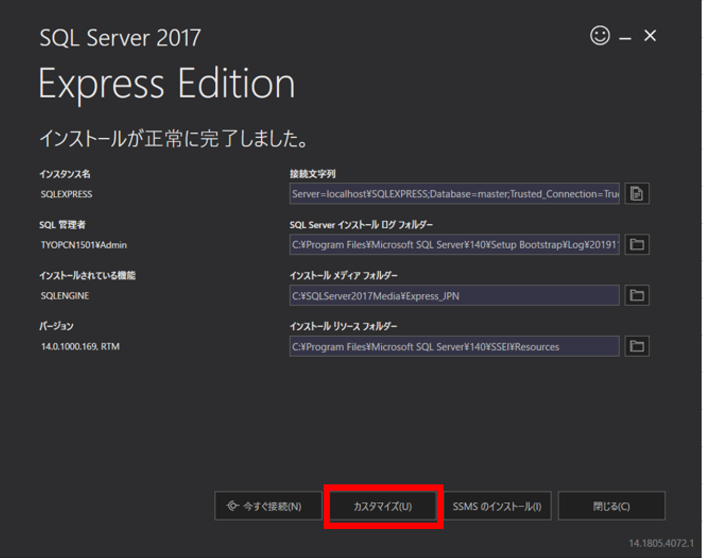 1)インストール完了後、画面下部の「カスタマイズ」を選択
