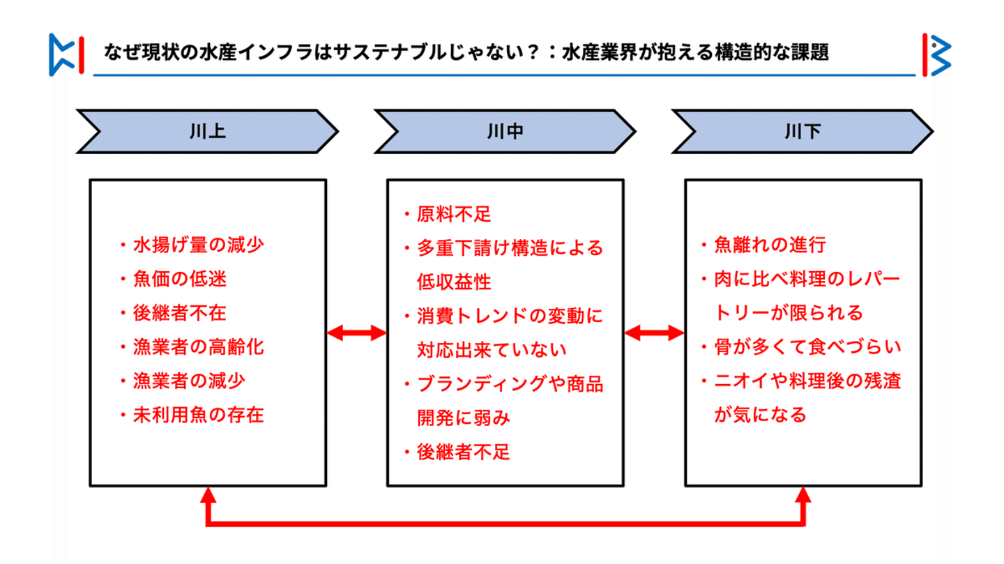 これらは別々の問題に見えますが、実はすべて連動しています。川上で魚が獲れなくなると、調達が難しくなり、高くて美味しくない商品ができる。結果、消費者の魚離れが進む。魚離れが進むと需要がなくなり、川中の仕事もなくなり、魚が余る。