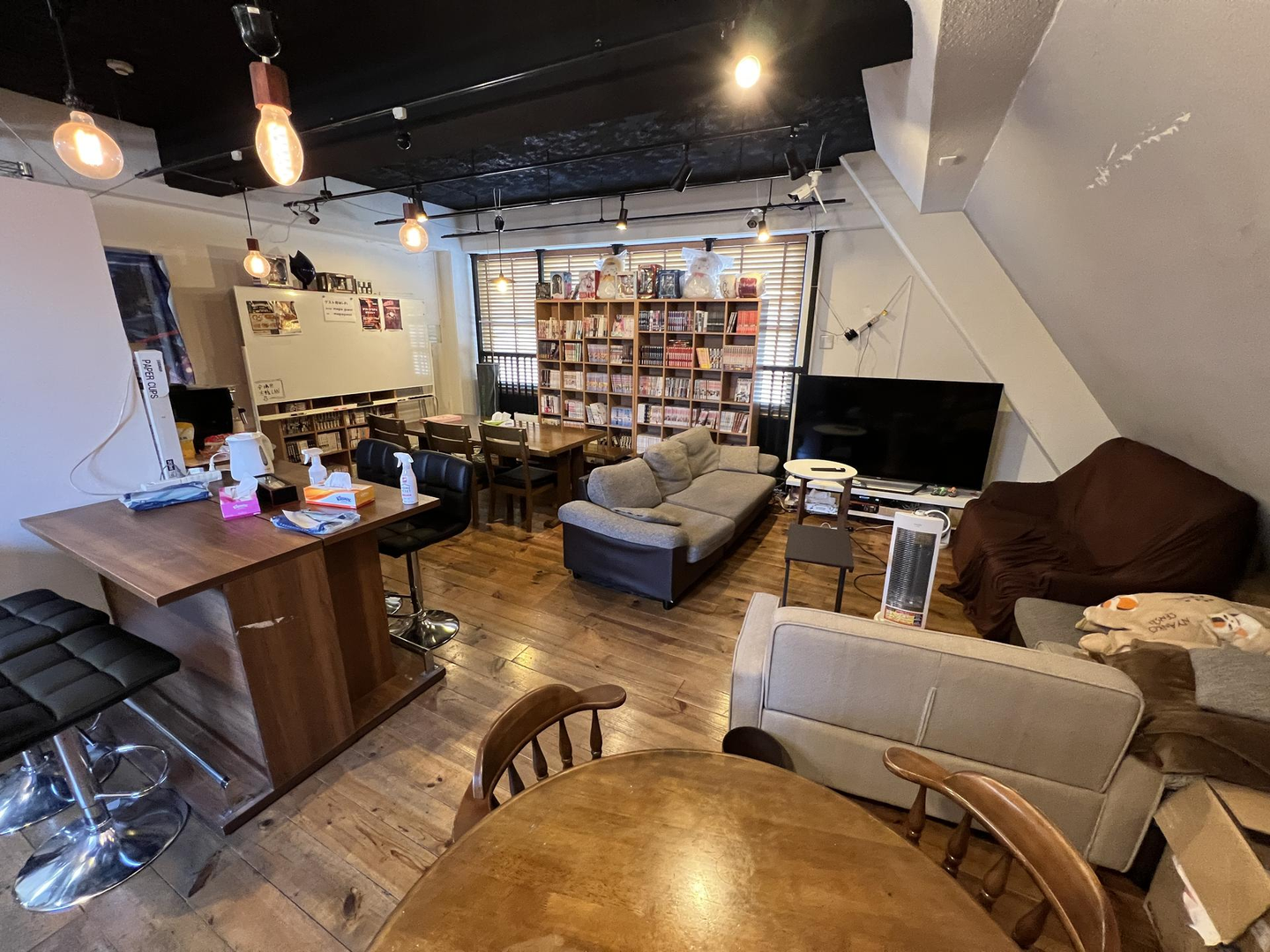 昼になるとご飯を食べる人やアニメを観る人で賑わいます。就業後もここでボードゲームや麻雀をする人もいます。