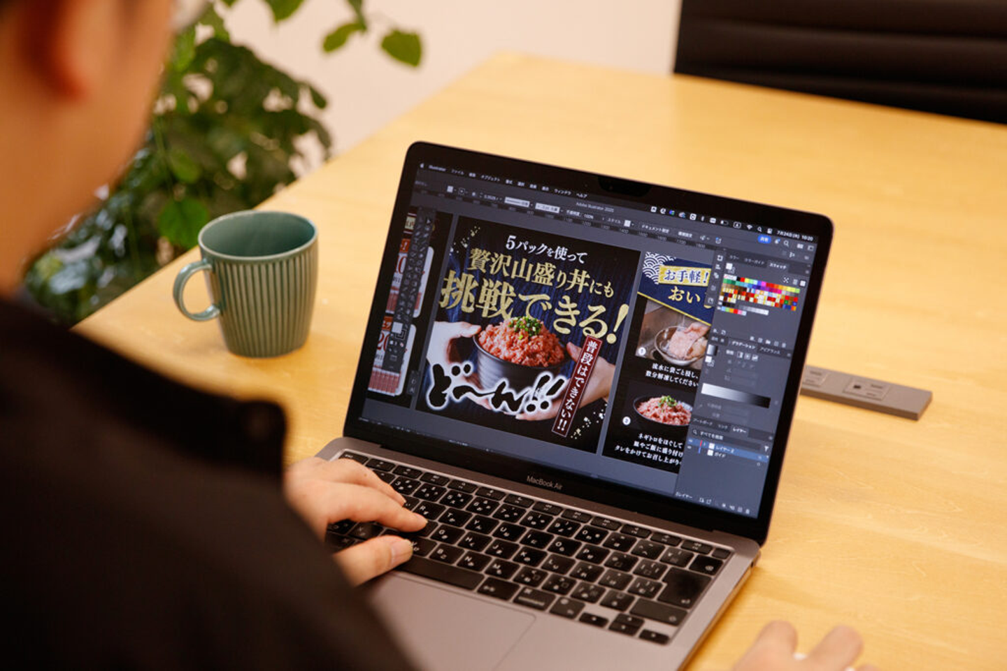 現在の主な仕事は、ふるさと納税のポータルサイトに掲載する返礼品の画像作成。最近は海産物の返礼品のデザインを多く手がけています。返礼品に選ばれているものは、もともと品質がいいものばかり。だからこそ、その魅力が確実に伝わるデザインにしたいと思っています。仕事のやりがいを感じるのは、自分が手がけた返礼品の寄附額が伸びたとき。また返礼品を提供していただいている事業者さんから直接「デザインが良くなったね」というような言葉をかけてもらうことも、大きな喜びになっています。
