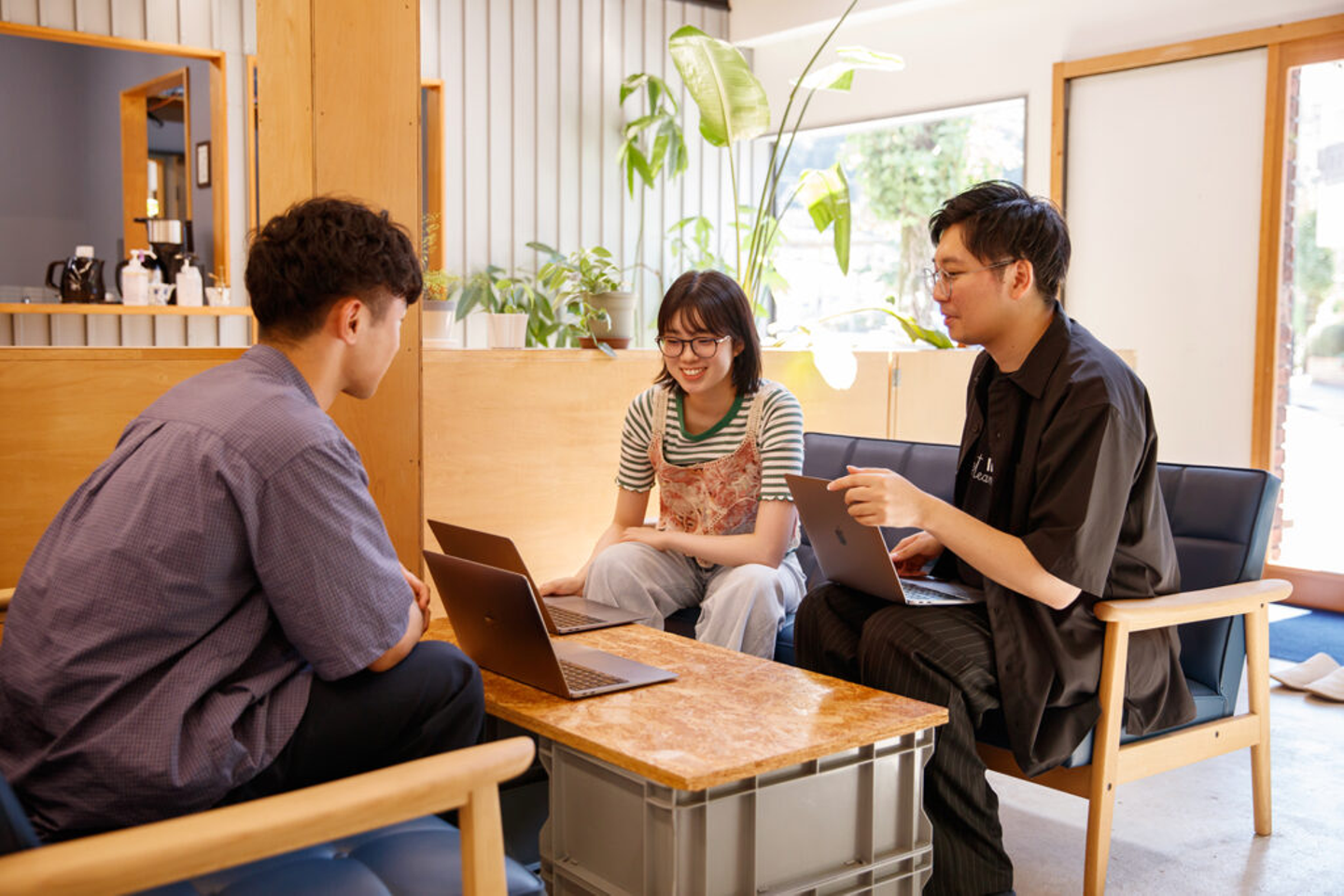 会社の雰囲気は「めちゃくちゃいい!」と思っていて 笑 デザイナーも、それ以外の職種の方も、みんな真剣に仕事していますし、会社全体としてイキイキしていると感じます。また先輩・後輩のような関係性をあまり感じません。先に入社したとか年齢による上下関係がなく、みんな「仲間」という印象です。そのあたりが働きやすさにつながっているのではないでしょうか。
