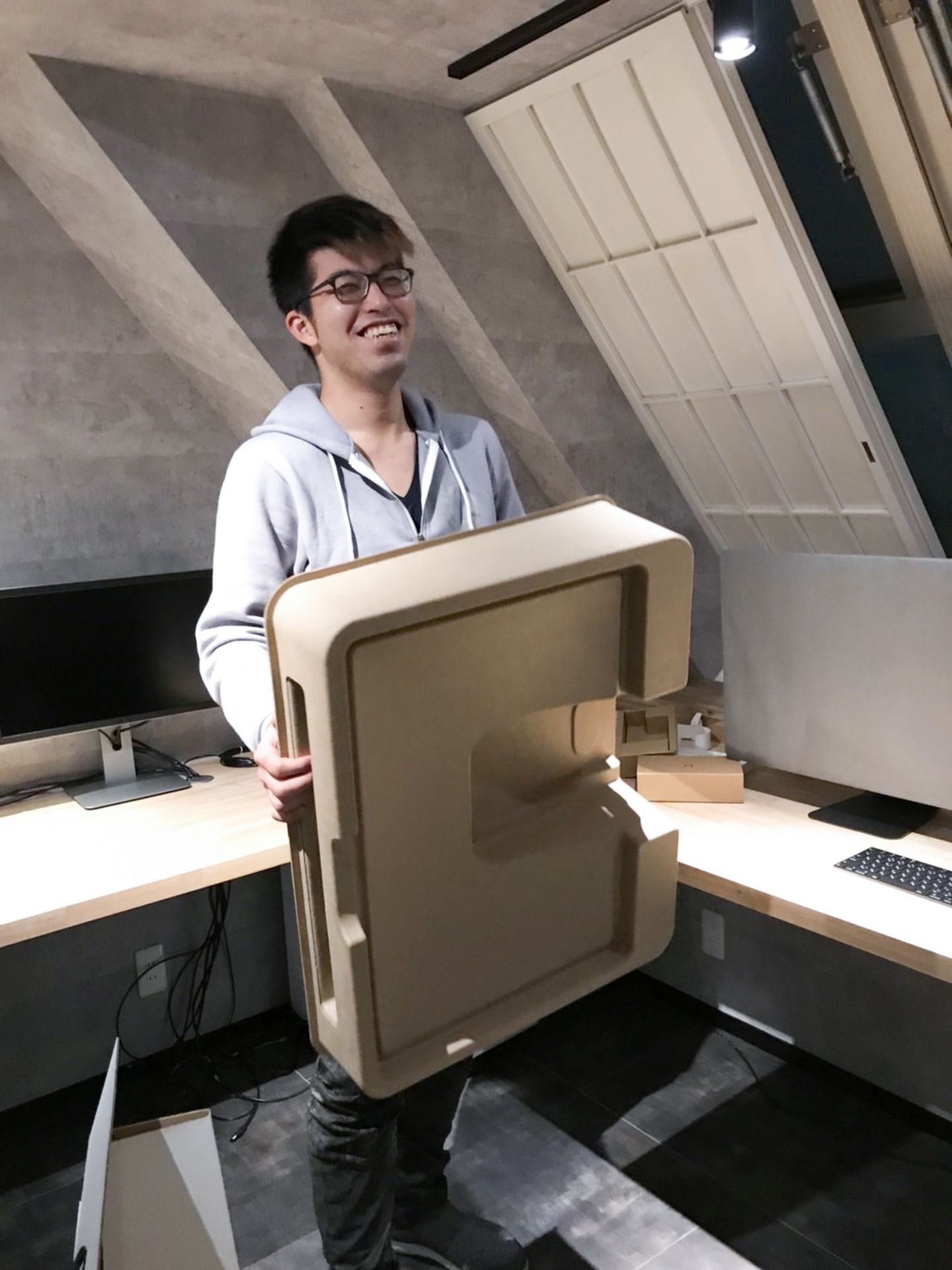 Macが入っていた段ボールを嬉しそうに抱えるギワさん