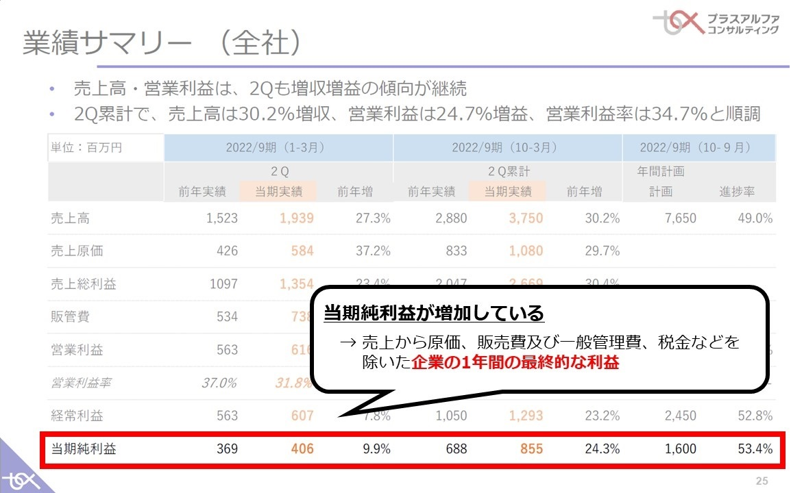 当期純利益は「企業の1年間の最終的な利益」、自己資本比率は「企業が自由に使えるお金の割合」を表しています。