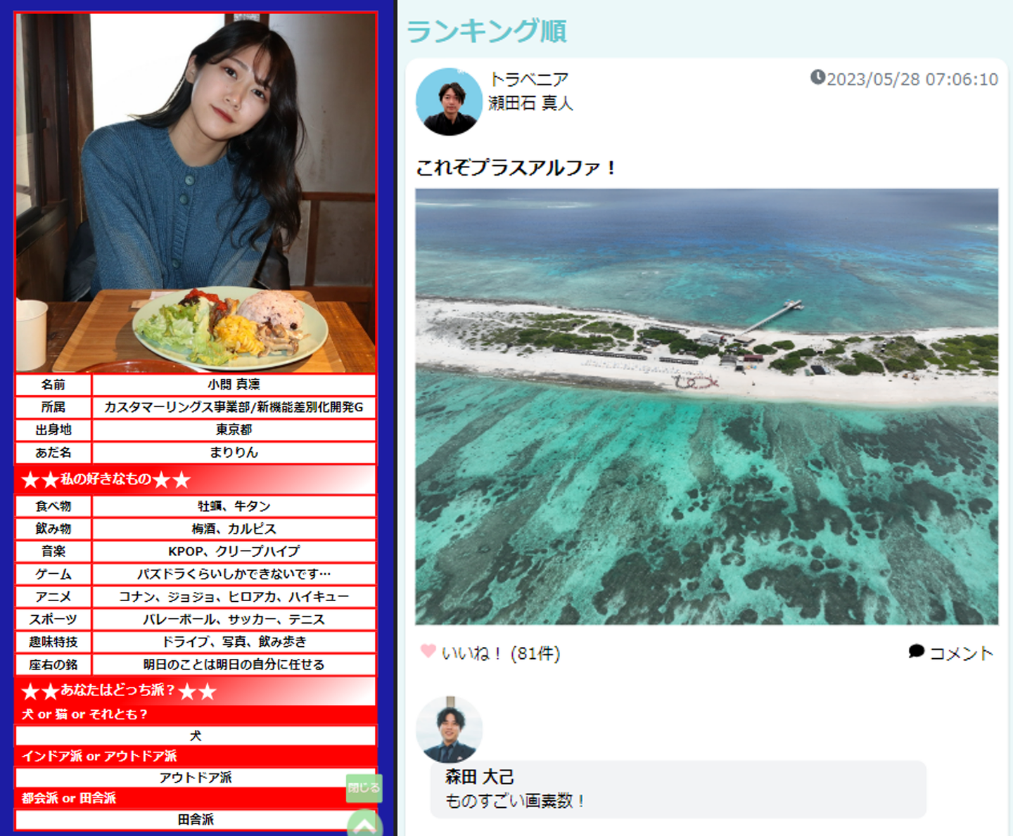 旅行中にはじめての人/あまり喋ったことがない人とも交流ができるように、しおりサイトで事前に回答してもらったプロフィールや質問がいつでも見れるようになってます! (新卒もとても助かりました!)