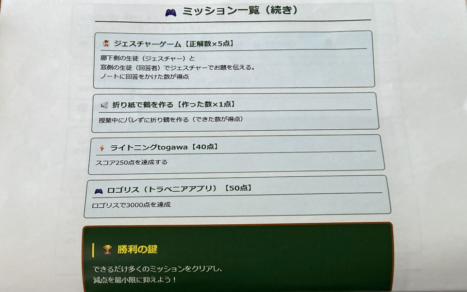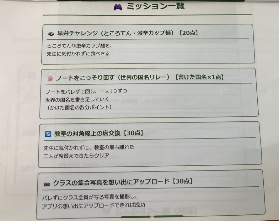 例えば…「早弁」「手紙まわし」「折り紙で千羽鶴をおる」「ゲームをする」など。より多くのミッションをクリアして、高得点を狙うのですが、「授業中」のため先生にバレないように行うというのが非常に難しかったです!先生に見つかった場合は、廊下に立たされます(笑)