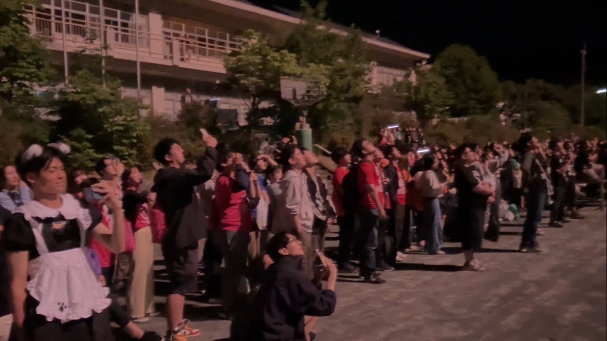 ▼打ち上げ花火は超こだわった!校庭で最初はみんなを取り囲むように扇形であげようと思ったが広さ的にNG、結局横一列&40Mの至近距離でインパクトをもたせた