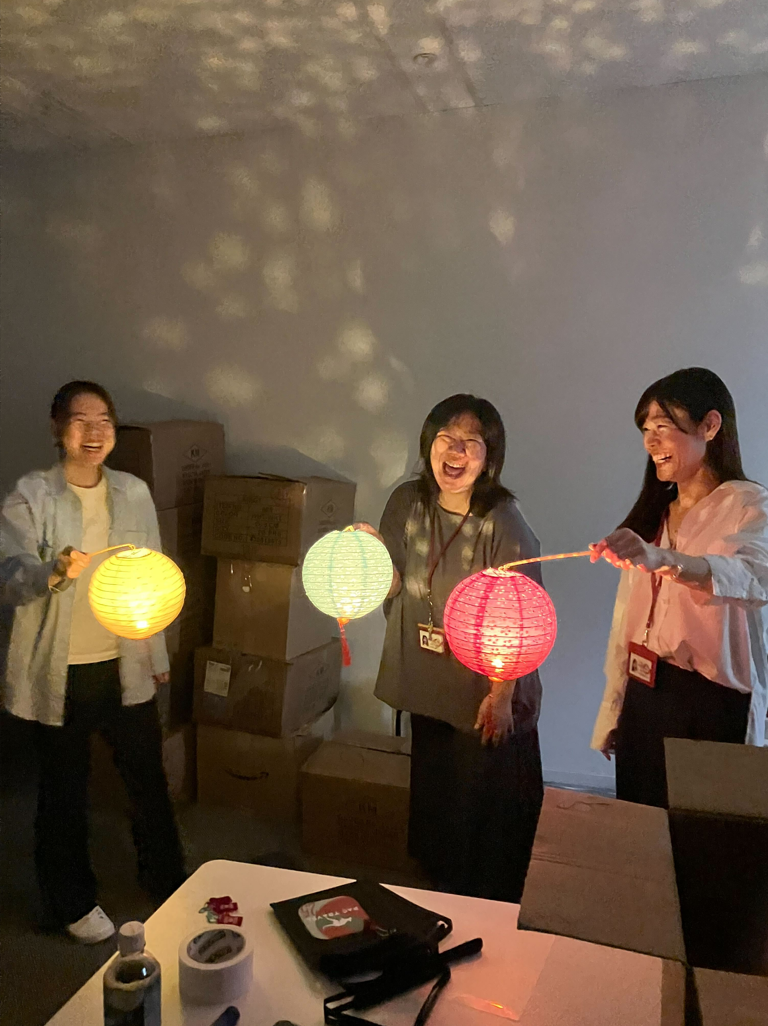 ・2日目夜の校庭に敷き詰めたカラフルな提灯も自分たちで広げて1つずつ作っていった