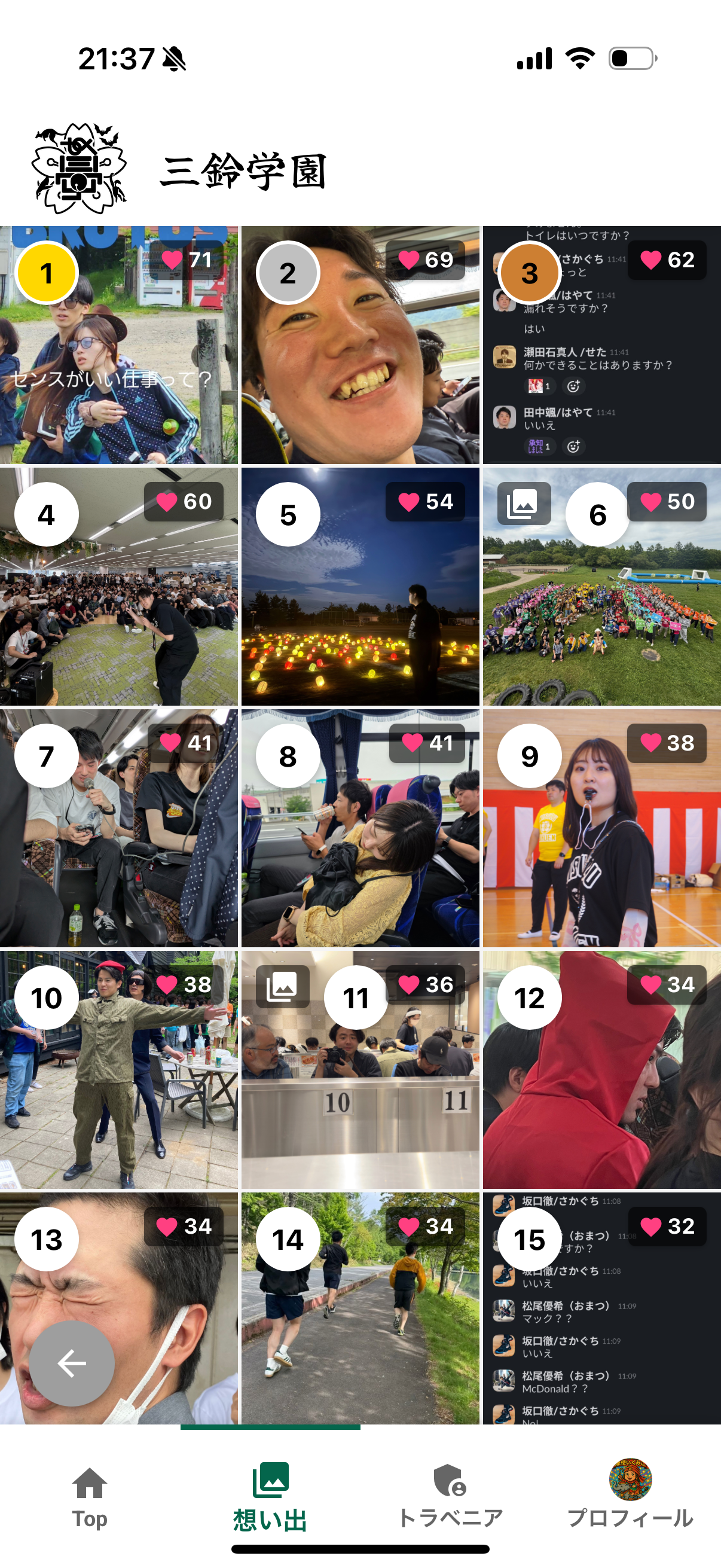 また、旅行アプリの想い出写真のランキングで上位15枚のうち7枚がトラベニアを写したものだったのも、充実した旅行であったことと、トラベニアへの感謝の気持ちが表れているなと感じました。