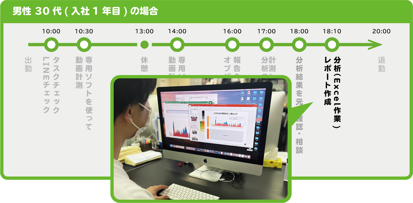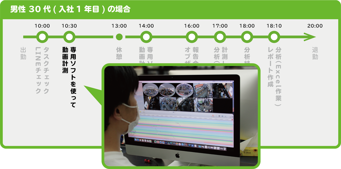 クラウドカメラで録画した店舗の営業風景や、時にはオリンピック代表チームの試合中のプレーを、スタッフや選手の動作を目視で計測していきます。お客様の代わりの目となり日々動画やデータを見続けることは、地道な作業の連続でもありますが、計測の末にお客様の現場改善につながる道筋を見つけ、分析結果から全国数千店舗の飲食店や小売店の業績を左右するオペレーションを見出す業務でもあります。