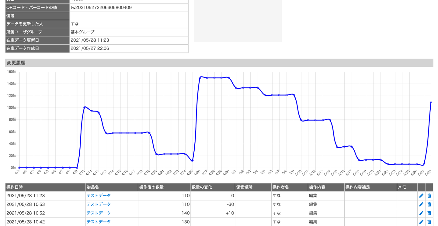 }あと変更がなかった日でも前日と同じ在庫数量を入れることで時系列グラフとして表示できるようにしました。