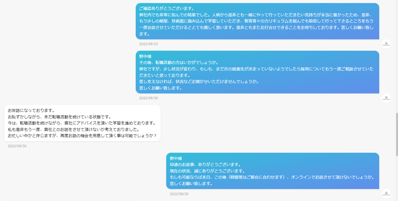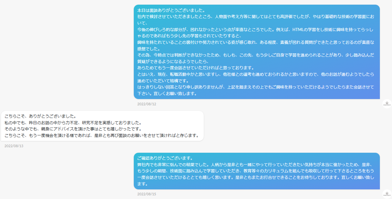 ショックでしたが、入社後にお互いのミスマッチが起こらないよう、ちゃんと伝えてくれたんだなとプラスの印象でした。