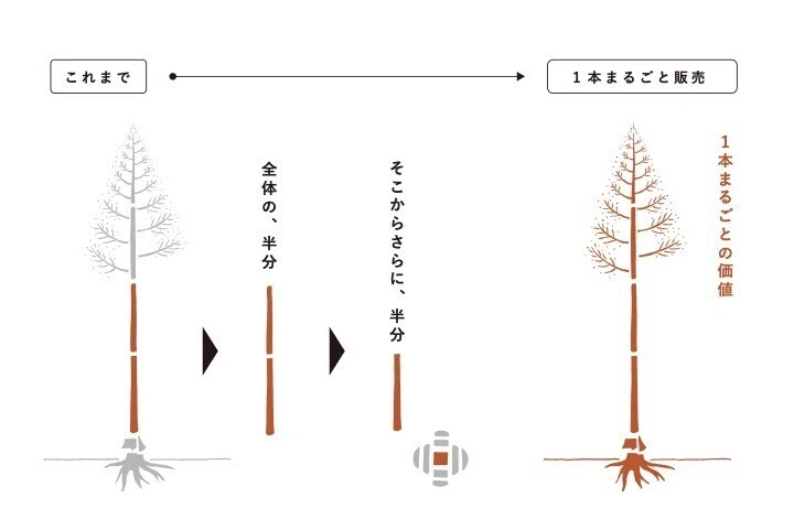 商品開発では会社の掲げる「1本まるごと木を使い切る」という概念をブランドに昇華させ、転職直前に"木山もの / somamono"というブランドを立ち上げています。林業の世界はほとんどすべての仕事が国や都道府県からの委託、補助金などで成り立っており、東京チェンソーズでは補助金ありきの構造からなんとか脱却できないかと考え、枝葉や根っこなど、通常は山に捨てられてしまう木の50%の部分をどう活かすかを議論し、新しい流通を生み出そうと努力していました。