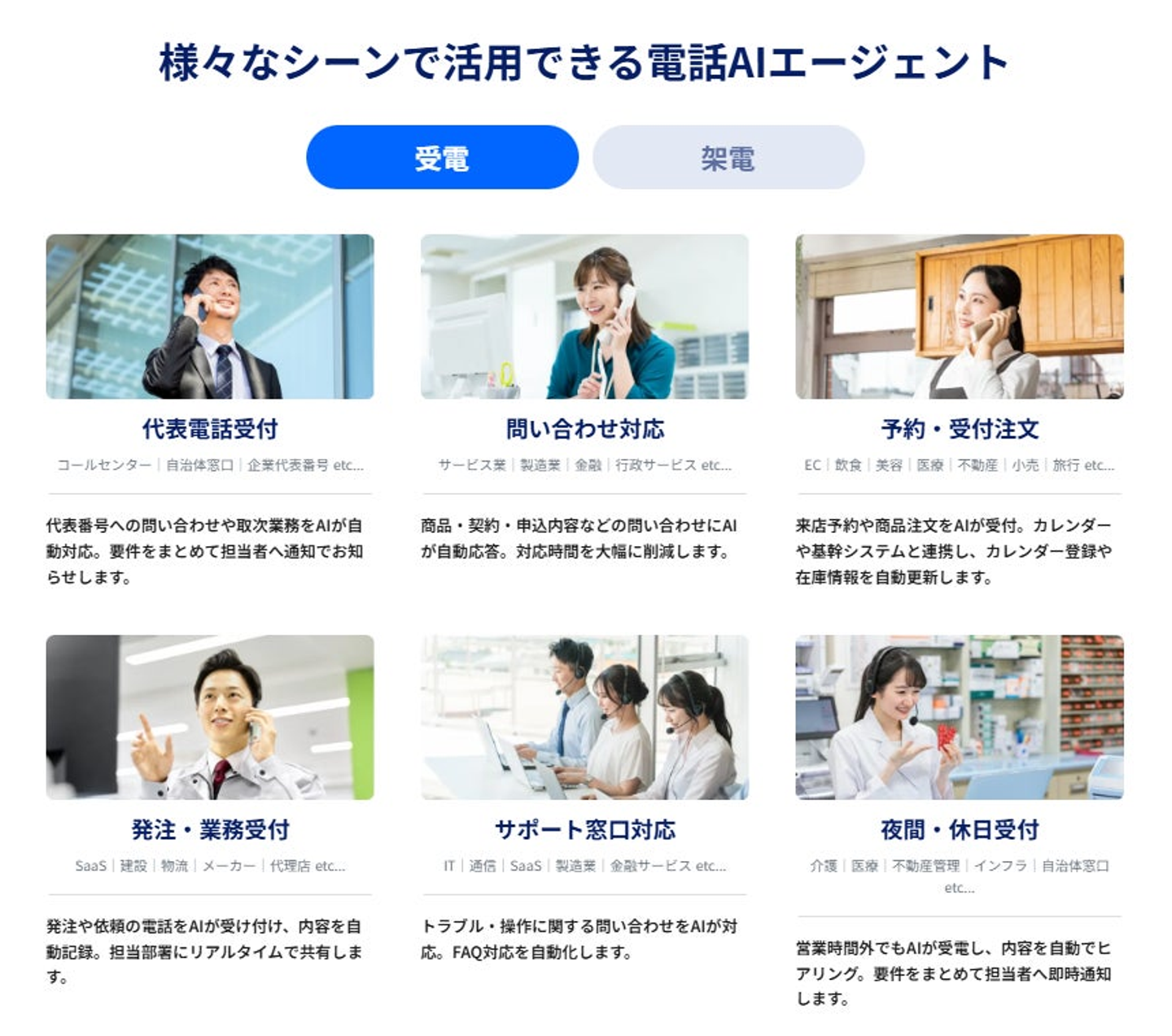 面談や商談前のリマインドコールや商品‧サービス契約後にあるユーザーからの頻度の多い質問など、定型的な電話業務を自動化することで、人的リソースに依存しない運用体制を実現する電話エージェントです。業務コストの最適化と生産性向上を同時に実現します。