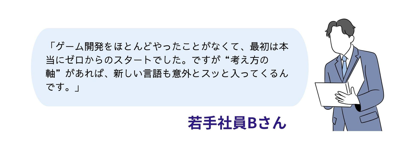 もう一人は、ゲーム開発の現場を担当。学生時代に学んだJavaとは異なるC#を使う仕事に挑戦しましたが、言語が違っても考え方には共通点があり、学びが繋がる瞬間を多く感じたそうです。